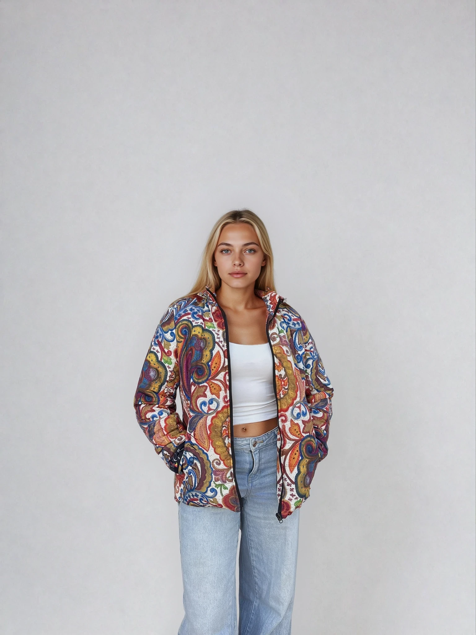 This Women's Jacket features the 'Bali' print from original art by Tiffany Marie Luke, giving off a trendy and artistic vibe. Perfect for women who appreciate unique and vibrant designs, this jacket is ideal for casual outings, art events, and everyday wear. Great for gifting during birthdays, holidays, or special occasions.