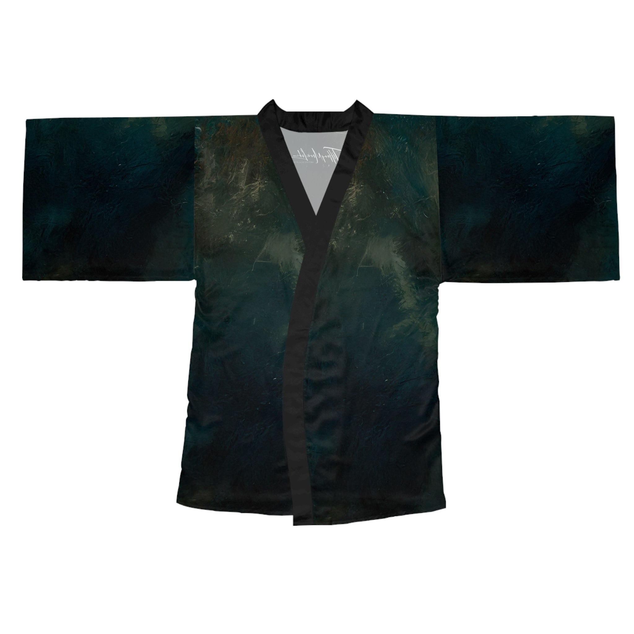 Elegant and versatile Kimono Robe featuring LaFille Gallery's "la Tigre" design by artist Tiffany Marie Luke. Perfect for lounging at home or dressing up for a party, this robe offers a smooth feel and figure-flattering shape. Ideal for those who appreciate unique and artistic designs. Relevant for holidays, birthdays, and special occasions.